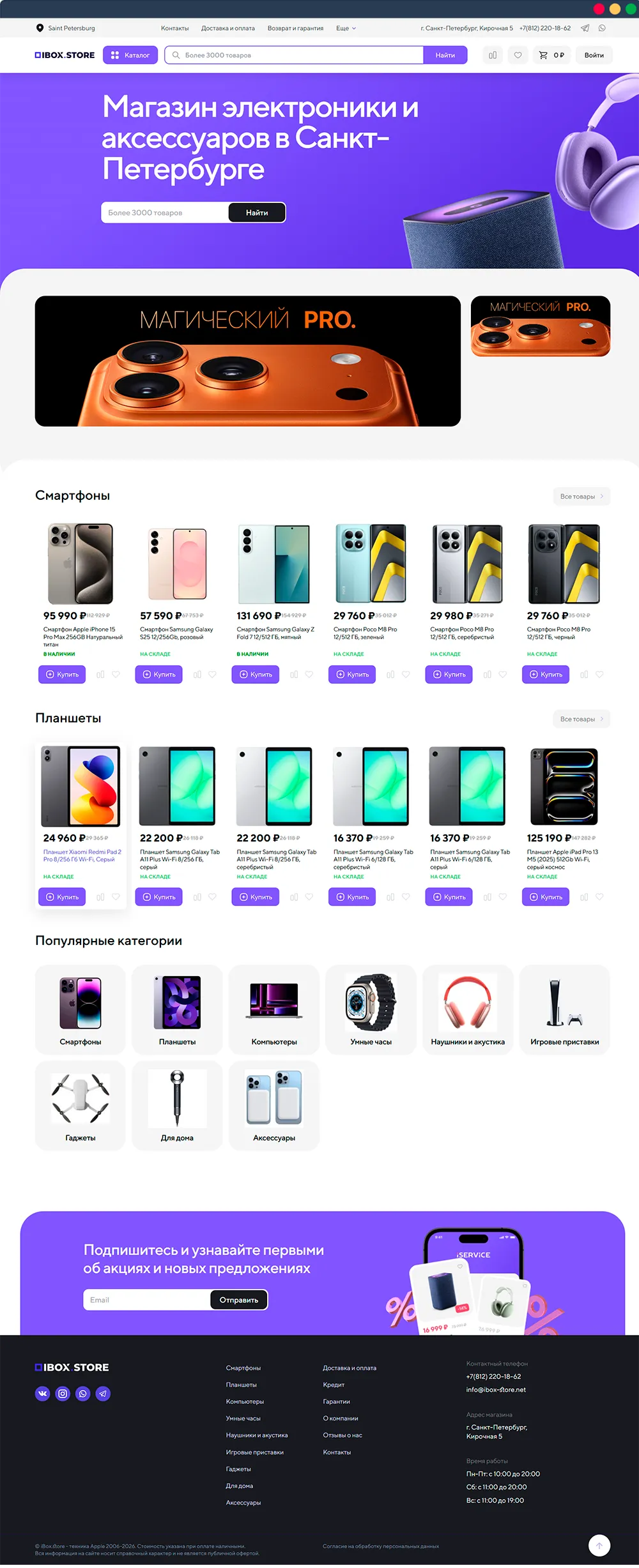 «iBox-Store» — магазин электроники и аксессуаров в Санкт-Петербурге. В каталоге представлены смартфоны, планшеты и другая популярная цифровая техника. Магазин ориентирован на частных покупателей и предлагает удобные способы оплаты, включая рассрочку и покупку в один клик.
